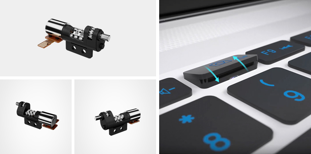 據(jù)了解,隨著筆記本逐步的輕薄化,也有廠商開(kāi)始追求極致的輕薄,追求極窄邊框,因此需要縮小屏幕周?chē)吙颍欢@正是大多數(shù)電腦攝像頭的安裝位置。為此,兆威別出心裁,開(kāi)發(fā)出一款帶翻轉(zhuǎn)功能的隱藏式攝像頭驅(qū)動(dòng)系統(tǒng),利用緊湊的微型驅(qū)動(dòng)結(jié)構(gòu),可以在有限的空間內(nèi),輸出較大力矩,使得攝像頭平時(shí)處于隱藏狀態(tài),當(dāng)需要時(shí)候,只需要按下鍵盤(pán)即可一鍵彈出。